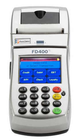 FD400-Ti Portable Price: $799.00 The First DataTM FD400Ti terminal is a wireless, hand-held point-of-sale device that merchants can easily use remotely to provide customers with the convenience of a full range of payment options. You’ll have access to wireless downloads wherever you are. And with the touch-screen interface, it is an easy product to train on and use.